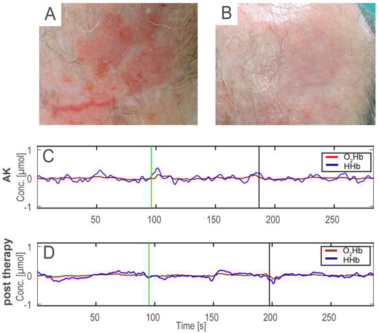 Figure 2 shows an example of AK before (A), after the therapy (B), and the HHb and O2Hb signals acquired on the AK before and after treatment (C,D).