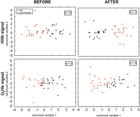 In the baseline condition, when the ice pack had not been applied, the epochs of both the HHb and O2Hb signals did not present significant differences (p > 0.0125). The after epochs (i.e., after ice pack application and removal) provide more information about the vascular response, since they were acquired after the cold stimulation and during the vascular recovery. In the HHb signals, the after epochs showed a p-value < 0.0125 and d = 1, according to the MANOVA analysis. This confirms that the features extracted from the NIRS signals in the different skin areas can be divided into two separate groups (AKs and treated skin), and the first canonical variable is sufficient to discriminate the differences between them (Figure 3).