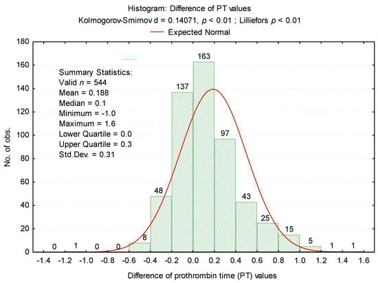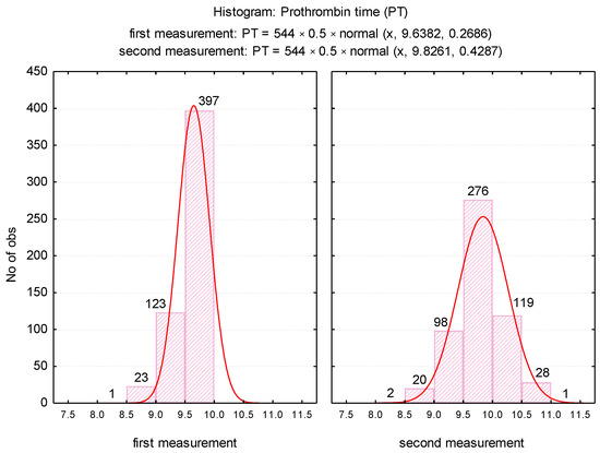 The mean PT was significantly higher (p < 0.001) after repeating the determination, increasing from 9.64 ± 0.3 (first determination) to 9.83 ± 0.4 (second determination). The variance of the values in the second determination was significantly higher than in the first determination (FLevene = 69.08, p = 0.001), which was explained by the significant increase in PT values in the case of 200 samples. For the duplicated assessments, it was noticed the maintenance of a normal distribution of the values (Figure 1), but the variation range was translated from the range 8.3 to 9.9 towards 8.1 to 11.1.