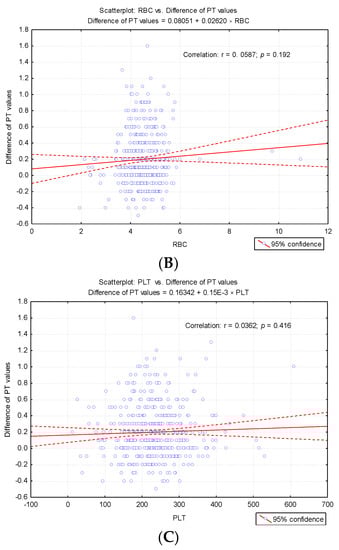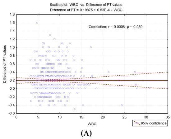 Regression line describing the variance of the PT test difference according to cellular elements count. (A) Regression line describing the variance of the PT test difference according to leukocytes (WBC) count. (B) Regression line describing the variance of the PT test difference according to erythrocytes (RBC) count. (C) Regression line describing the variance of the PT test difference according to platelets (PLT) count.