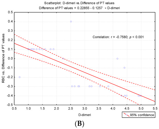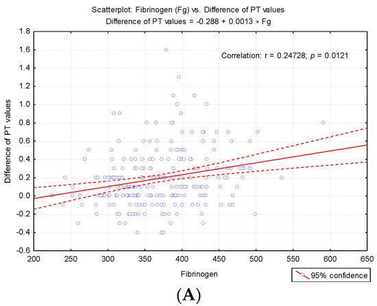 Regression line describing the variance of the difference between the PT test according to the level so fibrinogen (Fg) and D-dimers. (A) Regression line describing the variance of the difference between the PT test according to the levels of fibrinogen. (B) Regression line describing the variance of the difference between the PT test according to the levels of D-dimers.