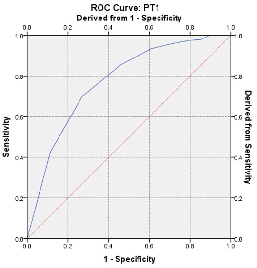 To evaluate the strength of PT discrimination on hypercoagulability, the receiver operator characteristic (ROC) curve was performed. The calculated AUC value was AUC = 0.774 (p < 0.0001, 95% CI: AUC → 0.7348–0.8138) (Figure 6).