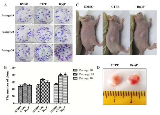 Clone formation in plate and tumor formation in nude mice using cells at passage 30. (A) Representative clones in different passages and groups. (B) The number of clones in different passages and groups (n = 3, *: CTPE vs. DMSO, p < 0.05. #: B(a)P vs. DMSO, p < 0.05). (C,D) Tumor formations were observed in nude mice on the 38th day after injecting CTPE- or B(a)P-induced BEAS-2B cells at passage 30.