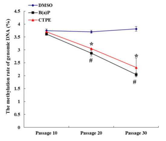 Methylation rates of genomic DNA in the cells from three groups. The methylation rates of genomic DNA in DMSO, CTPE, and B(a)P groups at different detection time points. The results were shown as mean ± SD (n = 3, *: CTPE vs. DMSO, p < 0.05. #: B(a)P vs. DMSO, p < 0.05).