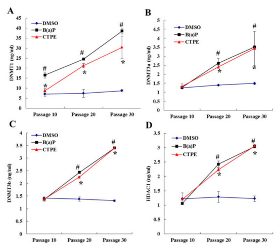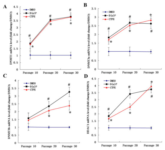 The mRNA levels of DNMT1, DNMT3a, DNMT3b, and HDAC1 of cells in the three groups. The mRNA levels of (A) DNMT1, (B) DNMT3a, (C) DNMT3b or (D) HDAC1 in DMSO, CTPE, and B(a)P groups at passage 10, 20 and 30. The results were presented as mean ± SD (n = 3, *: CTPE vs. DMSO, p < 0.05. #: B(a)P vs. DMSO, p < 0.05).