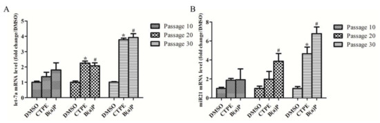 let-7a and miR-21 levels in cells at passage 10, 20, and 30 among three groups. The levels of (A) let-7a and (B) miR-21 in DMSO, CTPE, and B(a)P groups at passage 10, 20, and 30. The results were presented as mean ± SD (n = 3, *: CTPE vs. DMSO, p < 0.05. #: B(a)P vs. DMSO, p <0.05).
