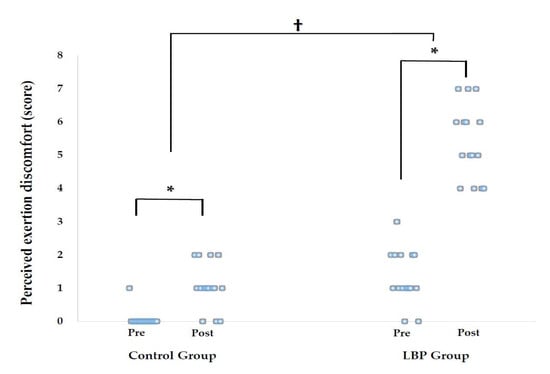 Additionally, this study measured the change in discomfort after slumped sitting, and found a significant difference between the groups. In the study conducted by Baker et al. [28], muscular fatigue did not change significantly after 2 h of sitting, but the discomfort in the lumbar region significantly increased due to the increase in the stress of passive tissues with decreasing lumbar lordosis. The slumped sitting posture was maintained against gravity with the spine flexed in the mid to end range, and the passive tissue took the load of the upper body [43,44]. Although not measured in this study, it was expected that the stress of the posterior spinal passive structure was greater in the LBP group than in the control group, as the LBP group maintained a kyphotic posture, while performing tasks.