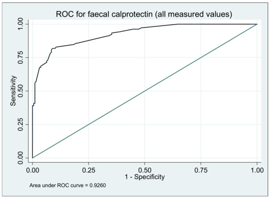 The statistical analysis was done using the STATA 13/MP statistical software. Sensitivity and specificity with 95% CIs for finding UCEIS levels was established according to calprotectin, C-reactive protein, and hemoglobin results. We analyzed the receiver operating characteristic curve and the area under the curve (AUC) to evaluate the appropriate cut-off values for calprotectin, C-reactive protein, and hemoglobin. Data were analyzed for normality (using the Kolmogorov-Smirnovff test and the Shapiro–Wilk test); consequently, parametric/non-parametric tests were used. The threshold of statistical significance was p ≤ 0.05.