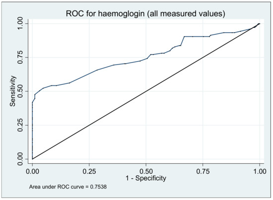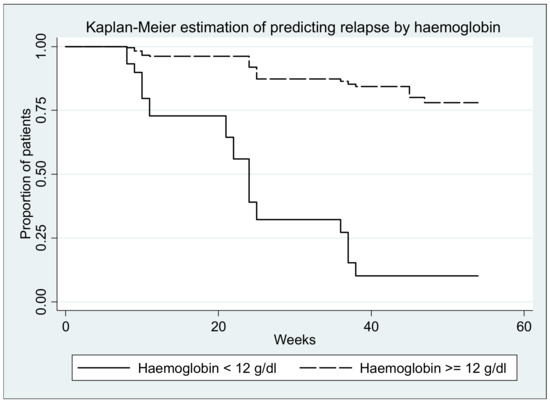 All patients were monitored during the study by hemoglobin value, biomarker which plays an important role in predicting a relapse (p = 0.0393). The value of hemoglobin was lower on those who presented a relapse at 3 months (median, range, g/dL; 12.9, 9.2–15.2) and 6 months (median, range, g/dL; 12.5, 9.5–15.3) compared to baseline (median, range g/dL; 12.8, 11–16.1). During the follow-up the area under the ROC curve was 0.7538 (Figure 3). The best cut-off point of hemoglobin values was 11.9 g/dL (sensibility 50.48%, specificity 96.84%, positive predictive value 89.83%, negative predictive value 80.34%) (Figure 3).