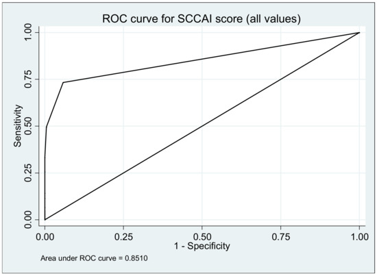 Area under the ROC curve to predict ulcerative colitis relapse using the Simple Clinical Activity Index of Ulcerative Colitis (SCCAI) score during 12 months.