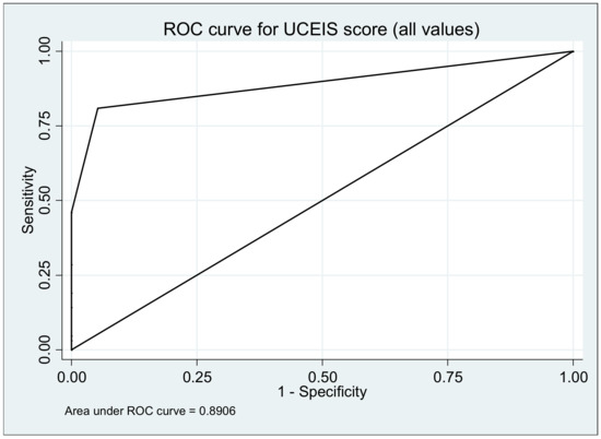 The assessment of mucosal healing was done according to the Ulcerative Colitis Endoscopic Index (UCEIS score) at the baseline, 6 and 12 months. At the 6 months the mean value of UCEIS was 1.3 with an IQR 0–7 and at the 12 months a mean of 0.6 and an IQR of 0–4 (p ≤ 0.0006). The OR for UCEIS score was 34.50 (95% CI, 12.06–98.74; p ≤ 0.00001). The area under ROC curve to predict UC relapse using UCEIS score was 0.8906 (Figure 5).