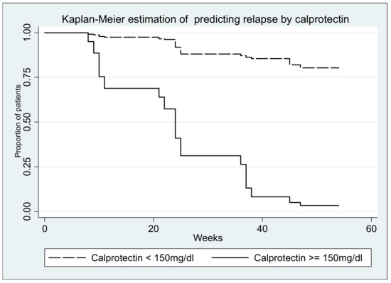 Log-rank test for equality of survivor functions (calprotectin) p < 0.00001.