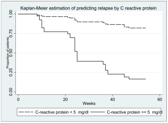 C-reactive protein, another marker of inflammation that can be used in determining the activity of inflammatory bowel disease, was assessed in the study, as well as its association with disease relapse. The measurement of CRP revealed higher values at 3 months (median, range, mg/dL; 1.8, 0.14–58.9), at 6 months (median, range, mg/dL; 2.36, 0.12–45.8) and at 9 months (median, range, mg/dL; 2, 0.12–25.9) compared to baseline (median, range, mg/dL; 1.26, 0.12–6.98).