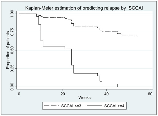On multivariate Cox proportional hazard analysis, a relapse was associated independently with the extension of the disease (E2-E3), increased FC level, C reactive protein, hemoglobin concentration, SCCAI index and UCEIS score (Table 3).≥
