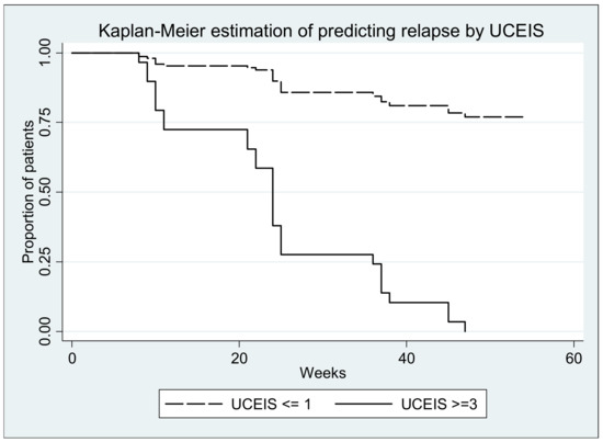 Our study shows that 35.6% of patients had a relapse during the study. Disease progression was associated with elevated fecal calprotectin, C-reactive protein and UCEIS score) during the 12 months of the study. As in other studies, serum and fecal inflammatory biomarkers (CRP, fecal calprotectin) were also compared with endoscopic appearance to monitor disease activity [4,5,6]. In our study, the association of FC with UCEIS was not significant for disease relapsing compared to CRP which had a better correlation with UCEIS. The two endoscopic experts used the UCEIS endoscopic score to establish the presence of disease activity, without knowing the patient’s biological parameters.