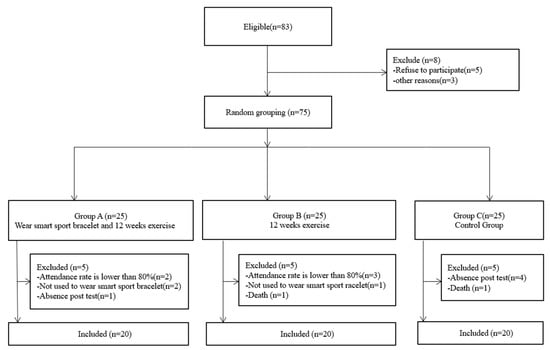 We undertook the following preparation before the start of the experiment: before the start of the experiment, the first 75 elderly participants in the study were randomly divided into 3 groups of 25 people each. After collecting basic personal information, including age and gender, each elderly person voluntarily signed an informed consent form for the study. The researchers (five registered physiotherapists and five activity coordinators in Macau) were trained in functional physical ability testing, and each experimental group was tested by the same group of researchers in order to complete the elderly motor motivation scale and collect basic data and pre-test scores. To prevent interference with the exercise intervention effect of this study, participants were required not to participate in similar sports training and intervention activities during the study period. The experiment intervention phase involved wearing sports smart bracelets during the 12 weeks of prescription exercise, which involved exercising three times a week for one hour at a time (including warm-up and strain relaxation). The exercise prescription was designed according to the U.S. Department of Health and Human Services [9] and the British Department of Health [10] exercise prescription recommendations (Schedule 3-3-5). The exercise only group (25 people) were involved in 12 weeks of elderly prescription exercise, which was the same as for the group exercising while wearing the bracelet. The control group (25 people) involved in the experiment for 12 weeks did not do any exercise, nor were they equipped with any sort of sports smart bracelets and products.