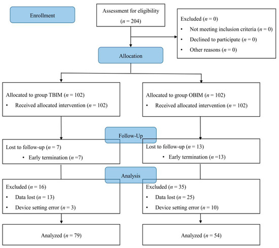 The number of excluded patients was significantly different between the groups (p < 0.001): 23 (22.5%) in group TBIM and 48 (47.1%) in group OBIM (Table 1). The reasons for exclusion included data loss during collection in 38 patients (18.6%), early PCA termination in 20 patients (9.8%), and device setting errors in 13 patients (6.4%; Table 1).