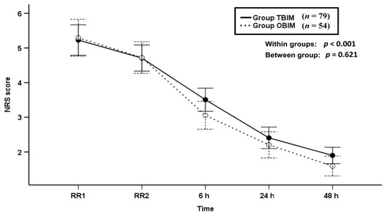 The NRS score was not significantly different between the groups throughout the postoperative period (p = 0.621), and it decreased with time in both groups (p < 0.001, Figure 2).