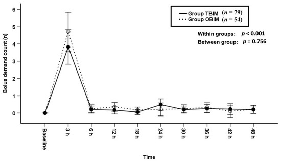 Time-sequential changes of bolus demand counts. Data points and error bars represent means and 95% confidence intervals, respectively. OBIM: optimizing background infusion mode, TBIM: traditional background infusion mode.