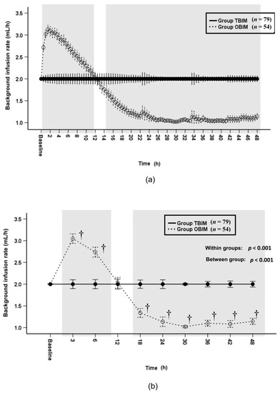 The background infusion rate was significantly different between groups throughout the postoperative period (p < 0.001, Figure 4a,b). The background infusion rate of group OBIM was significantly different from that of group TBIM for all time intervals except for the 12th postoperative hour (p < 0.001, Figure 4b). The background infusion rate was higher in group OBIM than in group TBIM before the 12th postoperative hour and lower from the 18th to the 48th hours (Figure 4b). The maximum and minimum background infusion rates were 3.3 (3.2−3.5) and 1.1 (1.0−1.2) mL/h, respectively in group OBIM, while the background infusion rate in group TBIM was constant at 2.0 mL/h.