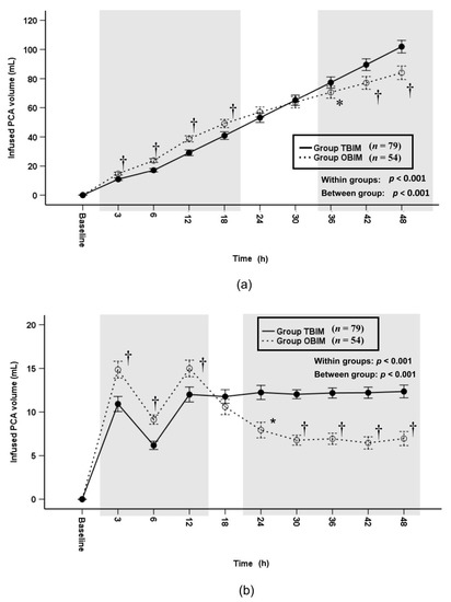 Time-sequential changes of cumulative (a) and per-interval (b) infused PCA volumes. The gray boxes represent the intervals in which there were statistically significant differences between the groups. Data points and error bars represent means and 95% confidence intervals, respectively. OBIM: optimizing background infusion mode, PCA: patient-controlled analgesia, TBIM: traditional background infusion mode. *: p < 0.05 compared with group TBIM, †: p < 0.001 compared with group TBIM.