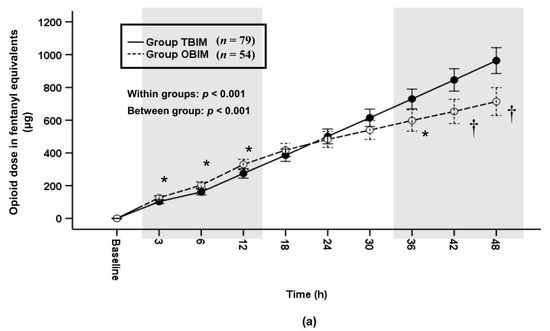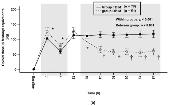 Time-sequential changes of cumulative (a) and per-interval (b) infused opioid dose in fentanyl equivalents. The gray boxes represent the intervals in which there were statistically significant differences between the groups. Data points and error bars represent means and 95% confidence intervals, respectively. OBIM: optimizing background infusion mode, PCA: patient-controlled analgesia, TBIM: traditional background infusion mode. *: p < 0.05 compared with group TBIM, †: p < 0.001 compared with group TBIM.