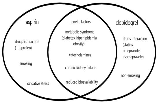 The other recognized risk factors for vascular diseases, such as atrial fibrillation, hypertension, ischemic heart disease, chronic heart failure, and alcohol abuse, and the biochemical parameters or markers of inflammatory and prothrombotic processes did not show any significant effect on the low response phenomenon, for both aspirin and clopidogrel. The similarities and differences between factors influencing high on-treatment platelet reactivity, both for aspirin and clopidogrel, are shown in Figure 1.