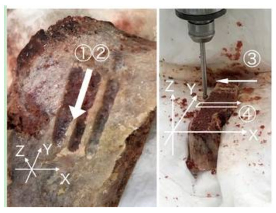 When the direction of travel was Y, assume that the components of the three axes, X, Y, and Z reflect torque stability, stable feed speed, and stable cutting depth, respectively, like in the manual ① and ② series. In ③ and ④, machine grinding travel X, X: feed, Y: torque, Z: depth were reflected. Furthermore, each measurement result was examined separately as follows: (1) differences due to the perfusion fluid environment; (2) differences due to the tissue; and (3) differences between manual and milling machines.