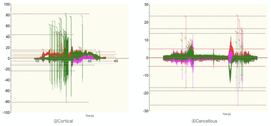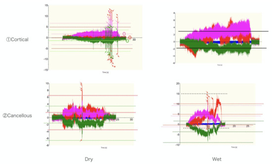 The numbers of spikes were as follows: ① Dry, Cortical-X 23, Y 10, Z 21, ① Wet, Cortical-X 0, Y 0, Z 0, ② Dry, Cancellous-X 0, Y 0, Z 5, ② Wet, Cancellous-X 0, Y 1, Z 11 (Figure 1 and Figure 2) ③ Wet, Cortical-X 92, Y 10, Z 19, and ④ Wet, Cancellous and Cortical-X 21, Y 25, Z 21 (Figure 1 and Figure 3). The components of each direction of the measurement result were recorded by three colors. The correspondence between the directions and the colors was as follows (x, y, z): (green, red, violet). The temperatures in ① were as follows: Dry, >270 °C, Wet, 61 °C (Figure 4). In ① and ② (manual grinding), each of the triaxial components were within −5.5~7.5 N, and the peak of the spikes were within −12.5~15.0 N. In ③ and ④ (grinding with a milling machine), in some cases, each component of the three axes were within −10~11 N, and the peak of the spikes were −80~80 N (Table 1).