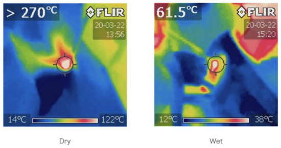 The records of the cooling effect of water when manually grinding cortical bone. Dry atmosphere on the left and wet atmosphere on the right. Water had a cooling effect of more than 100 °C in human bone grinding.