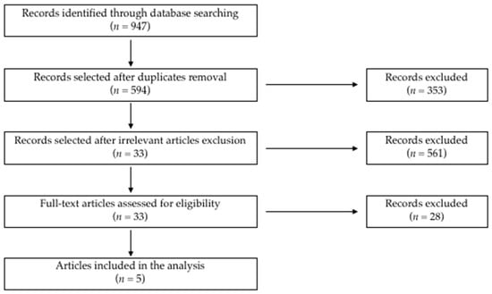 A flowchart depicting the electronic search of the articles is presented in Figure 1. We firstly retrieved 947 potentially relevant studies (PubMed n = 375, Scopus n = 450, and WOS n = 122). A total of 914 studies were subsequently excluded because they were either duplicates (n = 353) or irrelevant (n = 561). After a full-text evaluation of the remaining articles, 28 further papers were excluded as they did not meet the inclusion criteria. Finally, five studies comprising a total of 318 patients were included in the meta-analysis [,,,,]. The characteristics of these studies, published between 2007 and 2019, are summarized in Table 1.