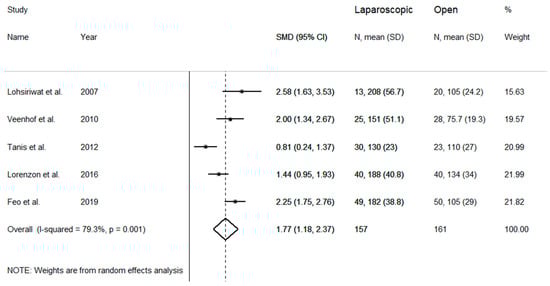 Mean operative time was evaluated in five studies with substantial heterogeneity (I2 = 79.3%, p = 0.001), requiring a random-effects model (Figure 2). Pooled results showed that mean operative time was significantly higher in laparoscopic than in open group (SMD = 1.77 min, 95% CI: 1.18 to 2.37 min; z = 5.84 p < 0.001). Sensitivity analysis was performed to evaluate results stability. The corresponding pooled SMD values did not significantly change after sequential removal of single studies, with effect size ranging between 1.62 and 2.00 days.