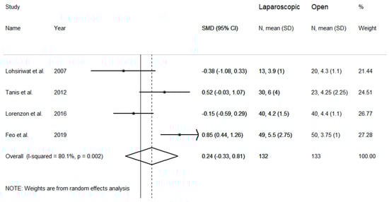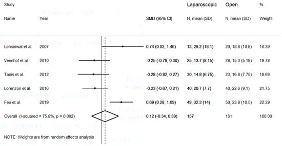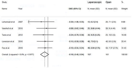 The length of hospital stay was evaluated in five studies (Figure 4). Pooled results showed nonsignificant trends towards shorter duration of hospital stay in the laparoscopic group when compared to the open group (SMD = −0.18 days, 95% CI −0.40 to 0.04 days; z = 1.56 p = 0.118). No heterogeneity between studies was observed (I2 = 0.00%, p = 0.98), therefore the fixed-effects model was used. Pooled SMD values were similar after sequential removal of single studies, with effect size ranging between −0.19 and −0.16 days.