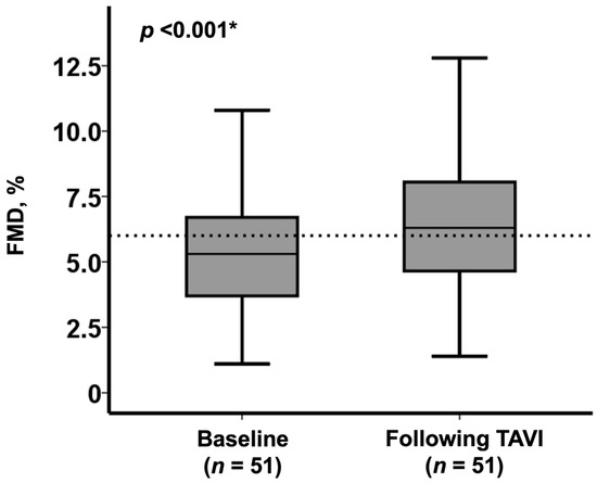 Change in FMD following TAVI in the overall cohort (n = 51) * p < 0.05 by Wilcoxon signed-rank test.