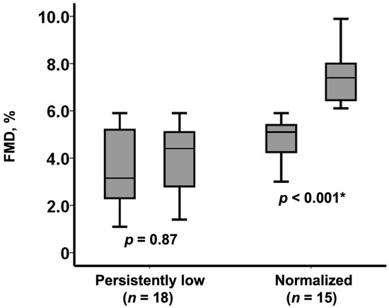 Among those with low FMD at baseline (n = 33/51), 15 patients achieved a normalization of the FMD value (from 5.1% [4.3%, 5.4%] to 7.4% [6.5%, 8.0%], p < 0.001), whereas FMD remained at low values in the remaining 18 patients (FMD from 3.2% [2.3%, 5.2%] to 4.4% [2.8%, 5.1%], p = 0.87) (Figure 2).