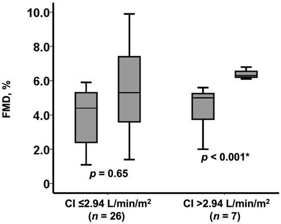 Change in FMD following TAVI among those with baseline low FMD (n = 33) stratified by the baseline cardiac index level. FMD remained low in 26 patients with low cardiac index whereas increased in 7 patients with high cardiac index. CI, cardiac index. * p < 0.0.5 by Wilcoxon signed-rank test.