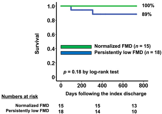 In-hospital mortality after TAVI was 0%, and there were only three all-cause deaths within two years (5.9%). Two of these deaths were in the baseline low FMD group, one of which was cardiac death. There were no heart failure readmissions. Patients with normalized FMD (n = 15) tended to have a higher two-year survival rate compared with those with persistently low FMD (n = 18) (100% vs. 89%, p = 0.18; Figure 4).