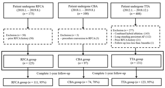 There have been many studies comparing TTA and CBA to RFCA, but there are no studies comparing all three simultaneously. In addition, due to the differences in enrolled patient characteristics, procedures, or follow-up methods in each study, outcomes were highly variable, and direct comparison between studies is difficult. Therefore, in this study, we present our experience comparing patient characteristics and outcomes among RFCA, CBA, and TTA.