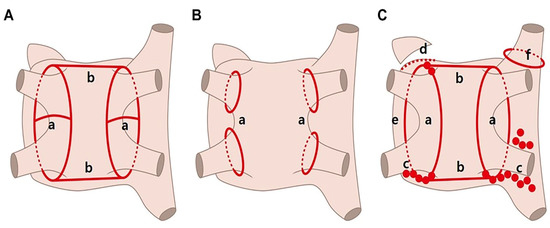 TTA refers to a video-assisted thoracoscopic surgical ablation technique performed without the assistance of the Da Vinci system (Intuitive Surgical, Sunnyvale, CA, USA) or cardiopulmonary bypass. This technique involves a bilateral approach requiring only three holes per side: a 5 mm port introduced in the fourth intercostal space at the midaxillary line and two ports placed in the third intercostal space at the anterior axillary line and in the sixth intercostal space at the midaxillary line. After pericardial tenting, a lighted dissector (AtriCure LumitipDissector, Atricure, Inc., Cincinnati, OH, USA) was used to pass a rubber band under the PV antrum through the oblique sinus. An AtriCure Isolator Transpolar Clamp was positioned around the PV antrum through connection to the rubber band. Bipolar radiofrequency energy was delivered six times to the clamps for PV isolation. Superior and inferior lines connecting both PV isolation lines were created using a linear pen device (Atricure, Inc.). The above method was first performed on the right side and repeated on the left side. Ganglionated plexuses were subsequently ablated with bipolar energy under high-frequency pacing. After PV and ganglionated plexus ablation, the ligament of Marshall was dissected and ablated. Once ablations were completed and conduction block was confirmed, the left atrial auricle was removed with an endoscopic stapling device (Figure 2C). All operations were performed by one experienced surgeon (DSJ).