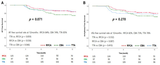 In total, 111 (95%), 74 (78%), and 123 (95%) patients in each group completed follow-up of more than 1 year. At 12 months, the AF-free survival rates for RFCA, CBA, and TTA were 84%, 74%, and 85%, respectively (p = 0.071; p = 0.859 for TTA vs. RFCA, p = 0.038 for RFCA vs. CBA, and p = 0.046 for TTA vs. CBA; Figure 3A). The ATa-free survival rate was 82% for the RFCA group, 73% for the CBA group, and 78% for the TTA group (p = 0.270; p = 0.332 for TTA vs. RFCA, p = 0.087 for RFCA vs. CBA, p = 0.410 for TTA vs. CBA; Figure 3B). The recurrent types of ATa are shown in Table 3. One patient in the RFCA group recurred with AF and atrial flutter. In the TTA group, one patient recurred with typical atrial flutter with AF, and the other one patient had recurred AF and atrial tachycardia.