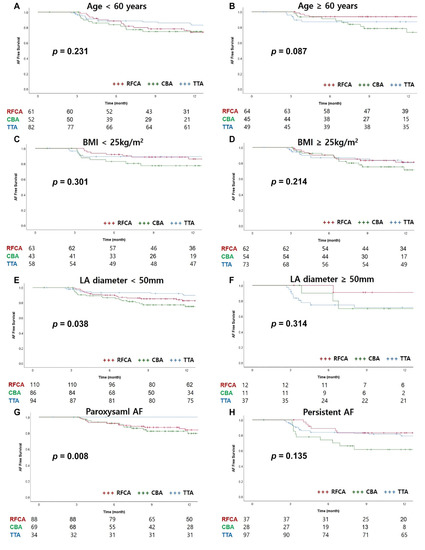 In the subgroup analysis of the AF-free survival rate, considering age, BMI, or LA diameter, there were no significant differences among the three groups (Figure 4). The AF-free survival rate in paroxysmal AF was significantly higher in the TTA group than in the other groups (p = 0.008). However, in persistent AF, the CBA group tended to have a lower AF-free survival rate, but there was no statistically significant difference (p = 0.315) (Figure 4G,H).