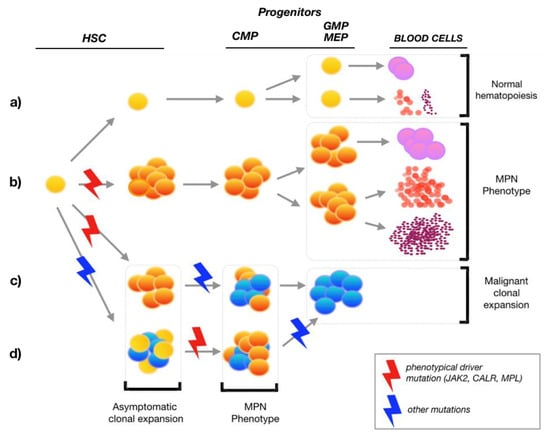 Looking at the hematopoietic maturation tree, HSCs give rise to multipotent progenitors (MPP) that differentiate in common myeloid progenitors (CMP) or common lymphoid progenitors (CLP). Then, from CMP arise granulocyte macrophages progenitors (GMP) and megakaryocyte erythrocyte progenitors (MEP). GMP and MEP are precursors of granulocytes, macrophages, megakaryocytes, and erythrocytes [,]. Drivers mutations as JAK2-V617F, CALR, and MPL occur in the hematopoietic stem cells, causing an MPN phenotype or, in presence of another somatic mutations, to a malignant clonal evolution and progression (Figure 1). Clonal expansion of the lymphoid compartment is not conspicuous, because JAK2 is more and more expressed in the myeloid lineage and increased in the more mature population [].