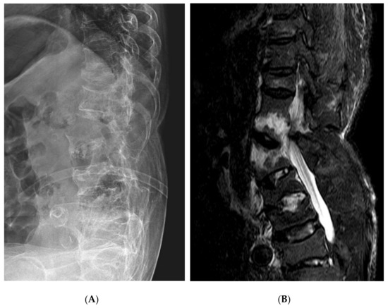 The lumbar spine lateral plain radiograph (A) and MRI sagittal view (B) after fracture.