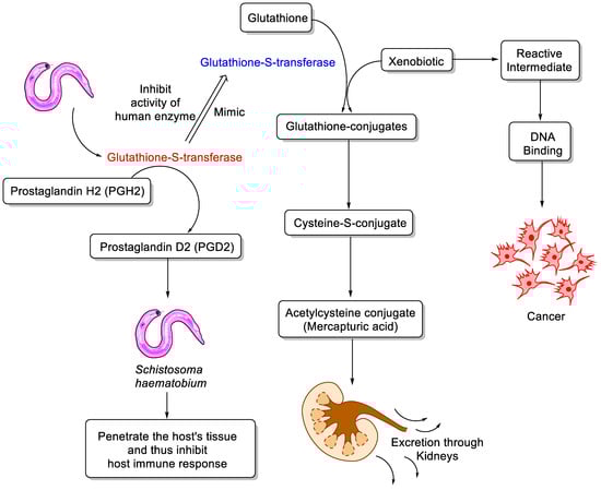Schematic view and biological role of glutathione S-transferases (GSTs) in Schistosoma parasite and cancer.