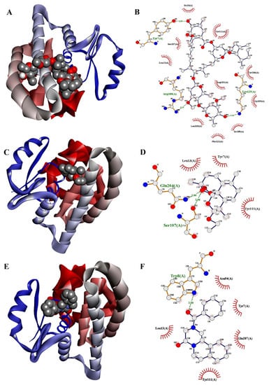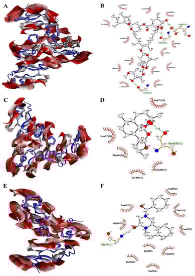 Three-dimensional and two-dimensional docked poses of GST-ligand complex for (A,B) ivermectin; (C,D) arteether; and (E,F) praziquantel.