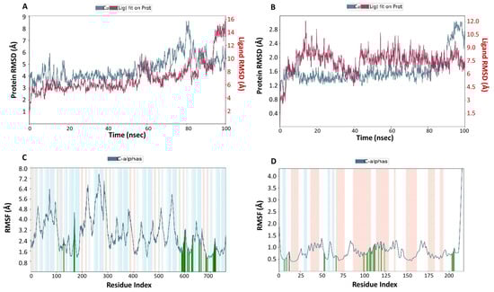 Conformational changes during MD simulation. (A,B) The plots showing RMSD values of ivermectin–VEGF and ivermectin–GST complexes during 100 ns MD simulation. (C,D) The plots showing RMSF values of ivermectin–VEGF and ivermectin–GST complexes during 100 ns MD simulation. In RMSF plots, the amino acid residues (interacted with the ligand) are shown by green vertical lines, whereas the salmon and cyan rectangles show the alpha helix and beta-strand domains, respectively.
