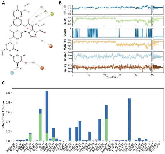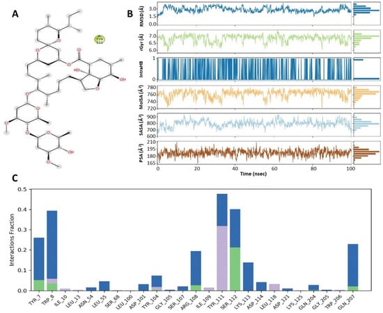 (A) Molecular interactions of ivermectin within the pockets of GST receptor at specific sites. (B) Demonstration of ivermectin properties as ligand against GST receptor. (C) A histogram displaying the different types of interactions within ivermectin–GST complex. The values of RMSD, radius of gyration, molecular surface area, solvent accessible surface area and polar surface area are peaked and represented by the blue line, green line, orange line, cyan blue line and brown line, respectively.