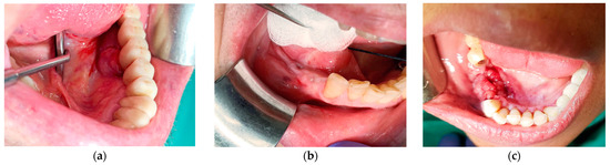 (a) A 74-year-old male with an exophytic mass on the lingual aspect of implant #36. The histopathological diagnosis was fibro-epithelial hyperplasia; (b) a 65-year-old female with a submucosal swelling surrounding a submerged implant #35. Two sinus tracts are evident on the buccal and lingual sides and one anteriorly to the site. The histopathological diagnosis was fibro-epithelial hyperplasia; (c) a 58-year-old female immediately after explantation of implants 45–46. The histopathological diagnosis was peripheral giant cell granuloma.