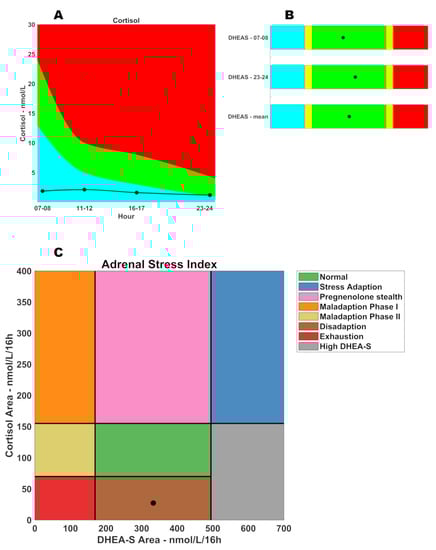 Adrenal Stress Index (ASI). (A) Circadian salivary cortisol; (B) circadian salivary DHEA-S; (C) ASI phase graph.