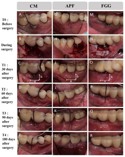 Clinical photographs at the following time points: before surgery (T0), 30 (T1), 60 (T2), 90 (T3), and 180 (T4) days after surgery. CM (A–F): porcine collagen matrix, APF (G–L): apically positioned flap, FGG (M–R): autologous free gingival graft from the palate. a: horizontal width of keratinized mucosa (KM): a distance between the extension lines in the apical direction at the mesial and distal margin of the implant prosthesis. b: vertical width of KM: a distance from the free gingival margin to MGJ (mucogingival junction)